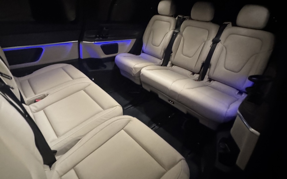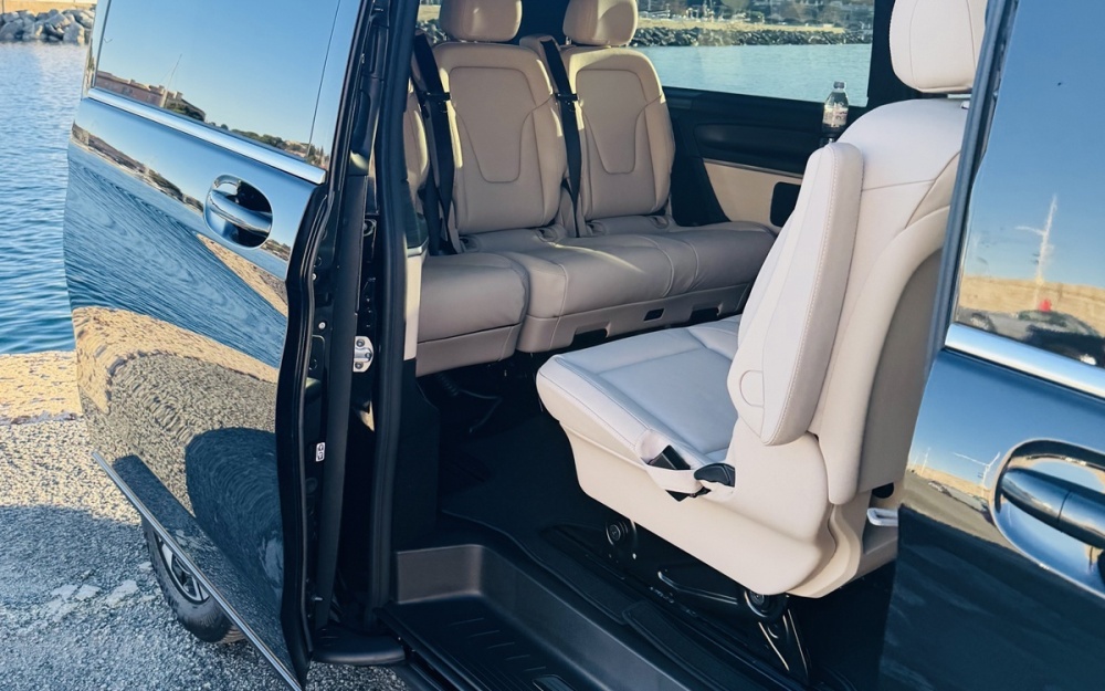 To transport you, I chose the Mercedes V-Class Extra Long 2025 in Avantgarde trim with beige leather interior.